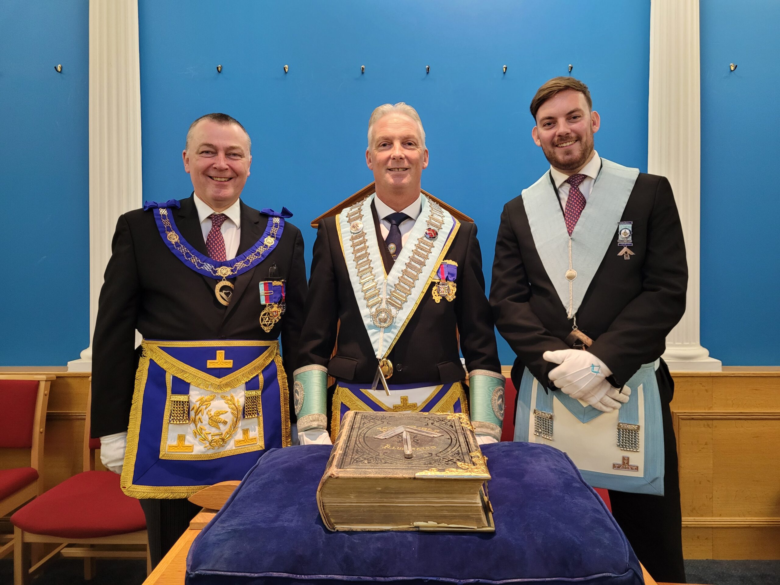 W Bro. Martin Francis – PSGD APGM with Officers of the Lodge 2025 - 2026 W Bro Dean Hankins, W Bro Coby Hankins.